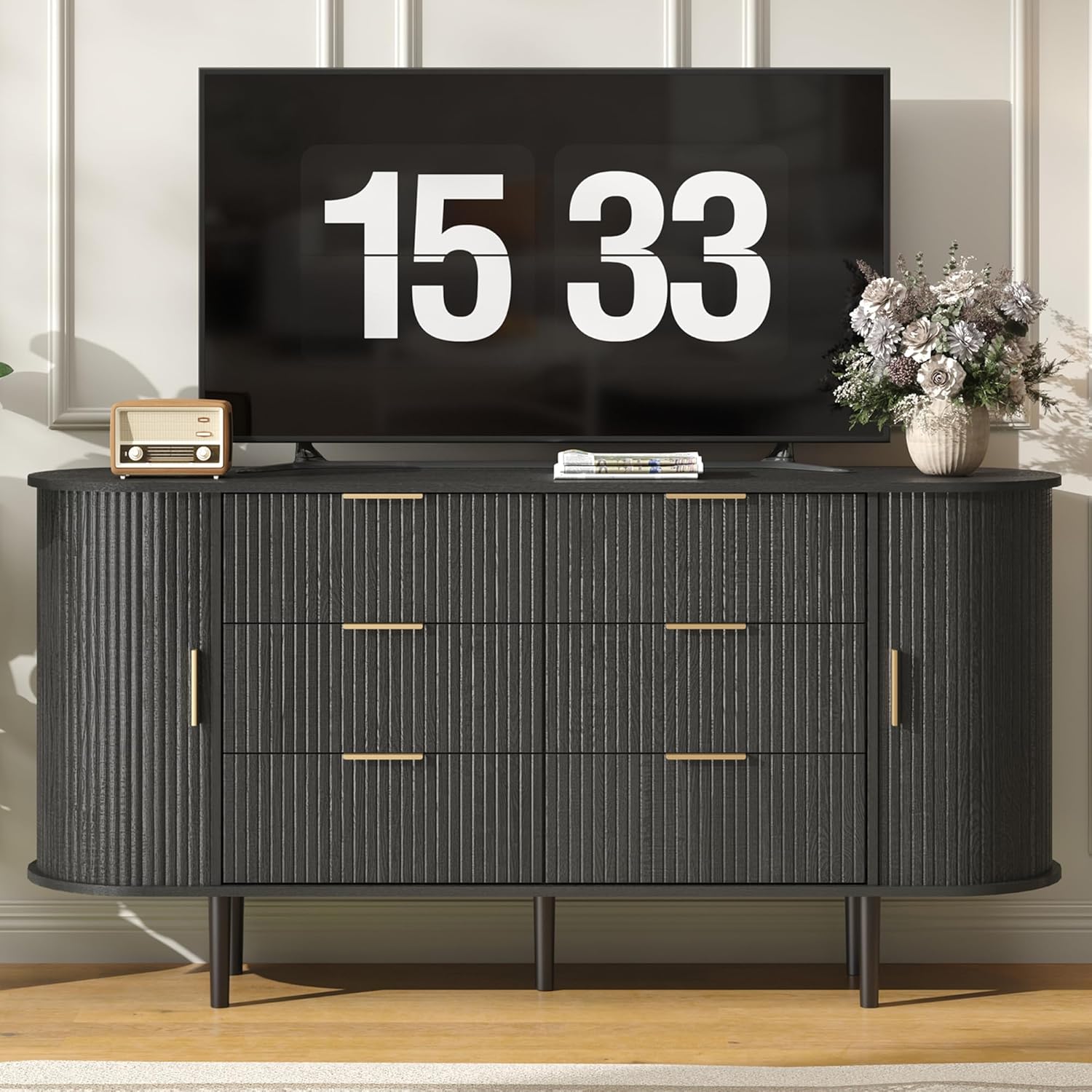 Modern Curved Fluted TV Stand for TVs up to 70 Inches, TV Console with Sliding Doors and Drawers, Credenza with Storage Cabinet for Living Room, 63 Inch, Black