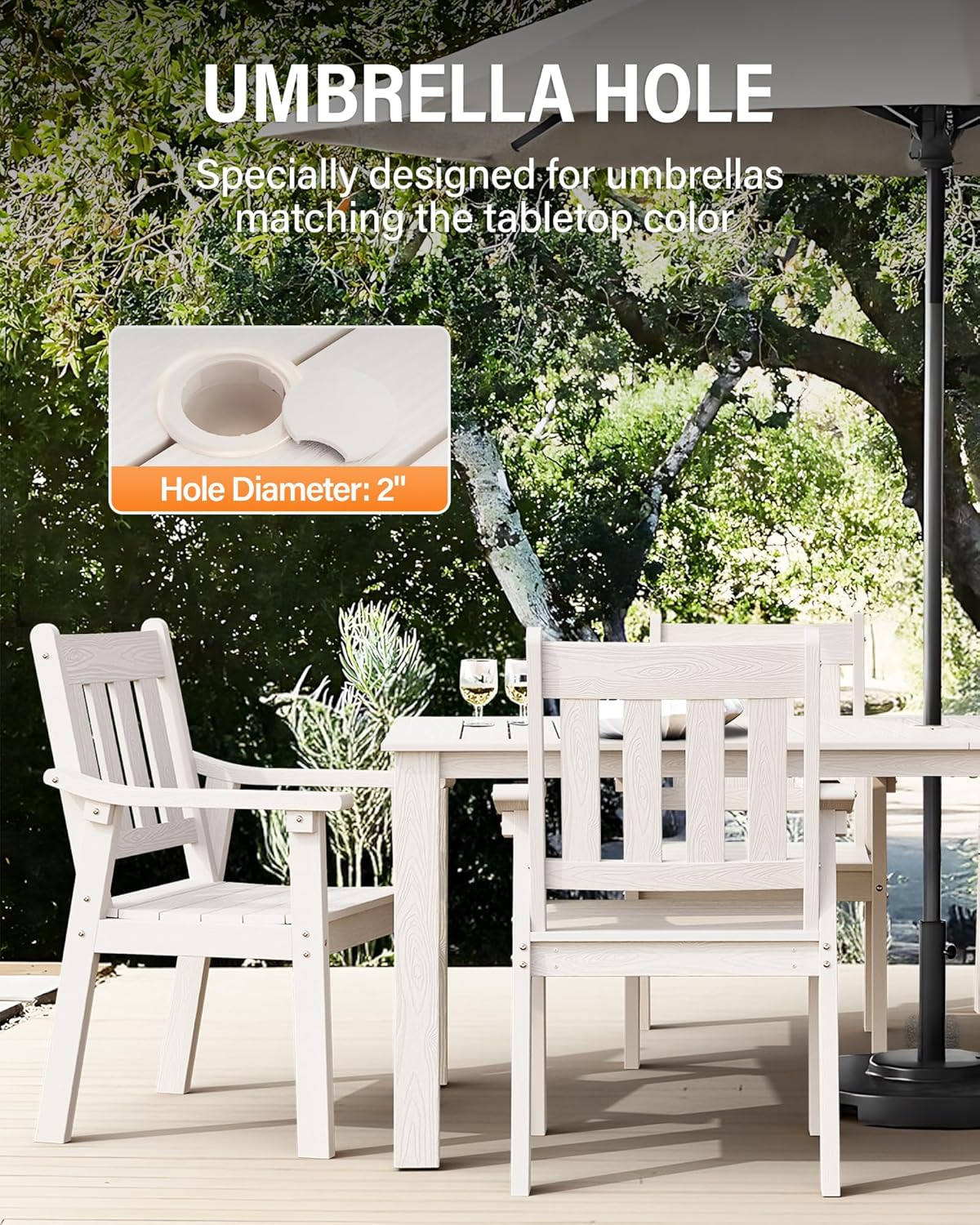 YEFU HIPS Patio Table Set: 7 Piece Outdoor Table and Chairs Dining Furniture Set with Umbrella Hole - White Modern Plastic Dining Sets 6 Person for Outside Deck with Metal Aluminum Frame