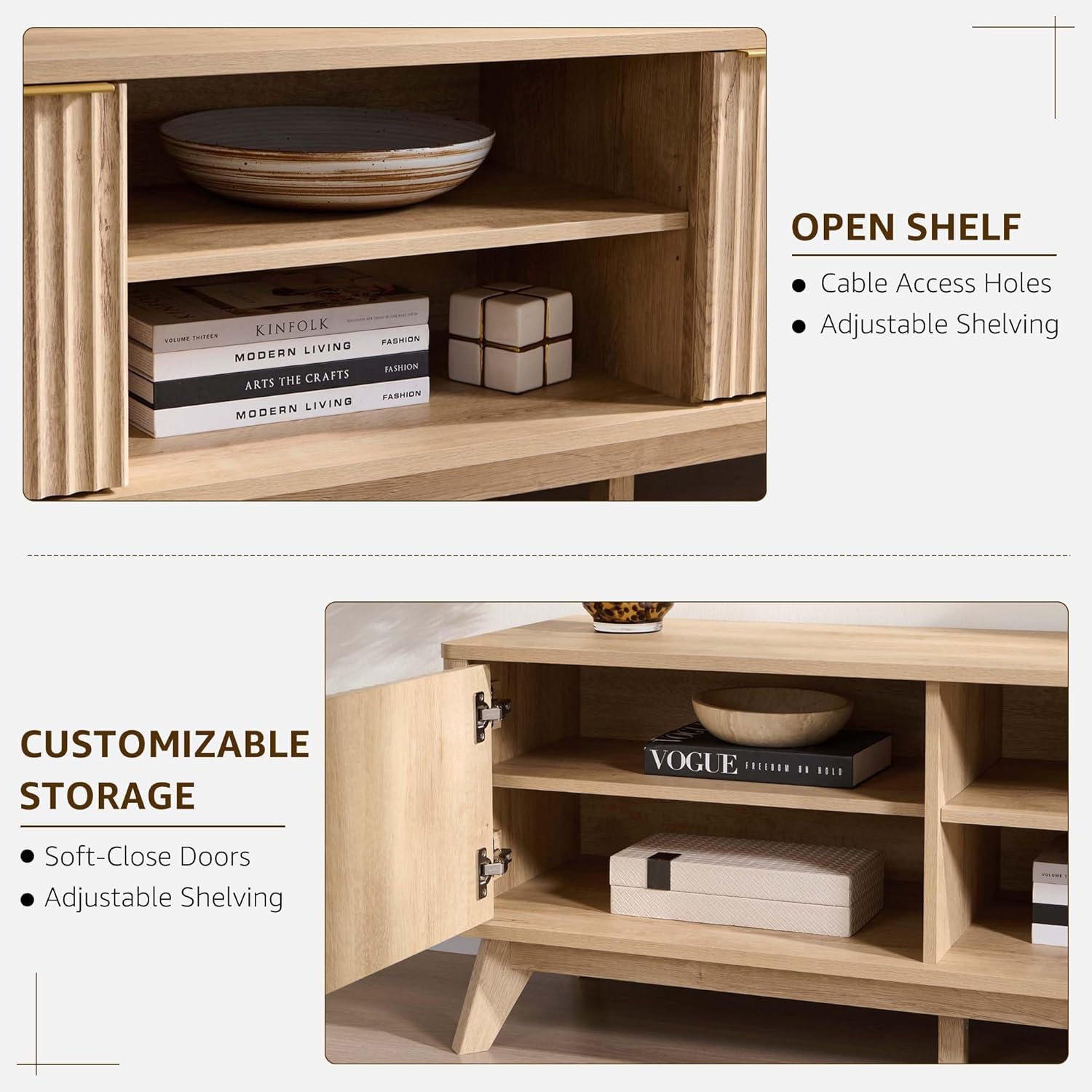 • 𝗠𝘂𝗹𝘁𝗶-𝗙𝘂𝗻𝗰𝘁𝗶𝗼𝗻𝗮𝗹 𝗨𝘀𝗲: Beyond a TV stand, it serves as an elegant console table, sideboard, or bedroom addition. The spacious top is perfect for displaying art, vases, or family photos, adding to your space's aesthetic.