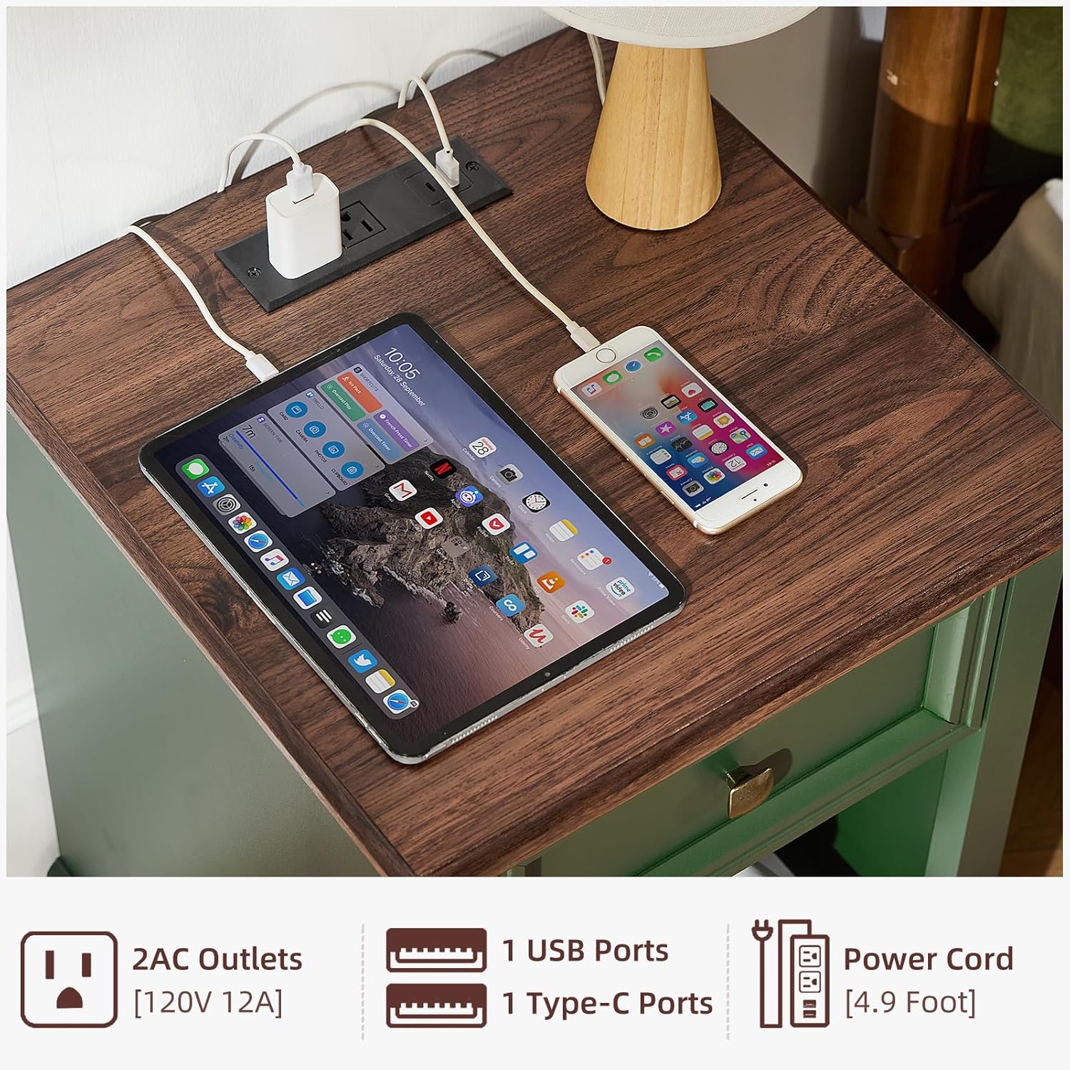 Farmhouse End Tables Living Room with Drawer, Rustic Wood Nightstand with Charging Station, Bedside Table with Open Shelf for Bed Room, Living Room, Green