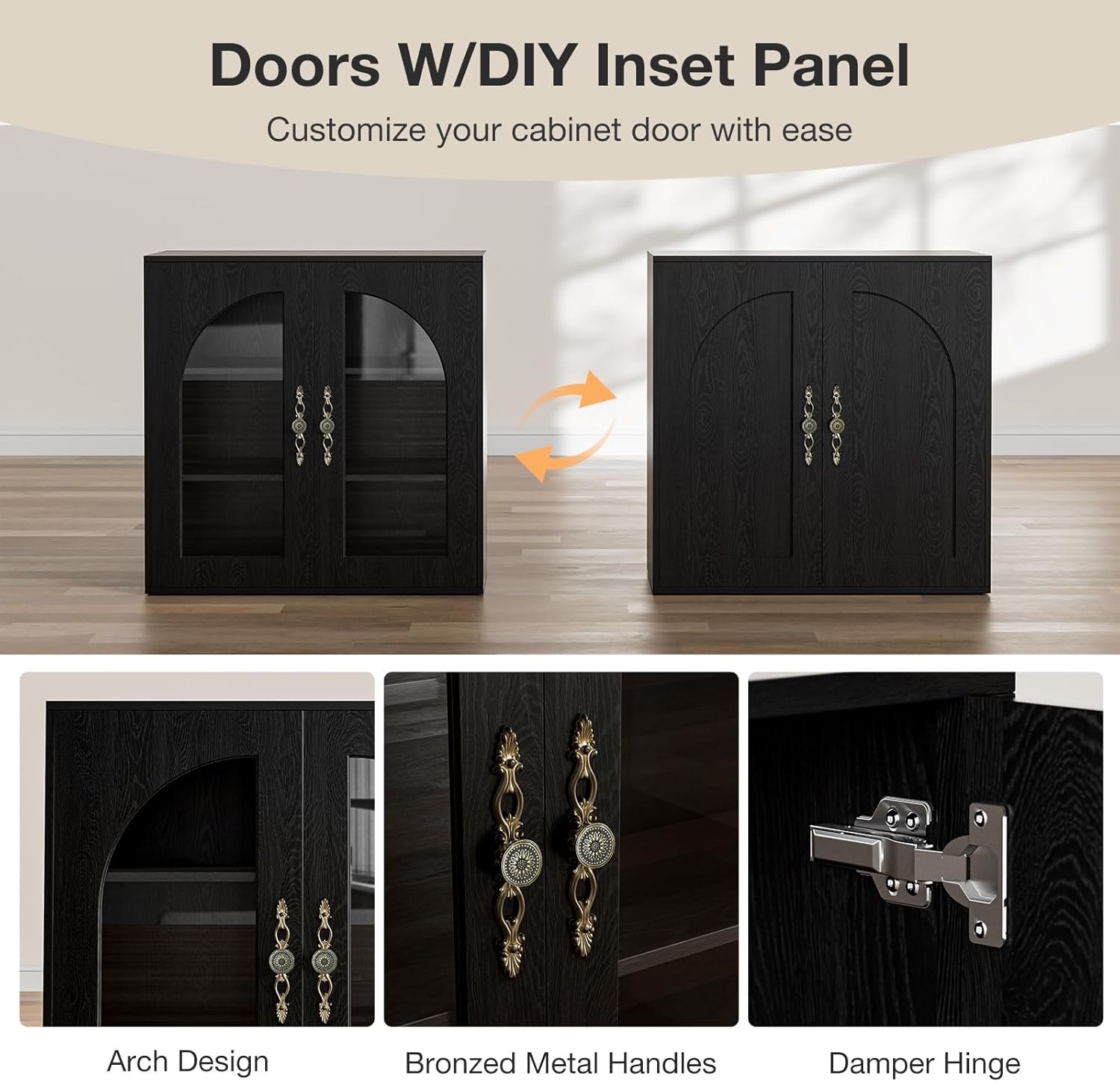 • Replaceable Door Panel:Features recessed door panel frames, equiped with 2 kinds of panels, you can diy the cabinet door with glass or wooden panels.The glass doors could display your favorite decor and convenient for using, while the wooden doors provide hidden storage for dining essentials or others.