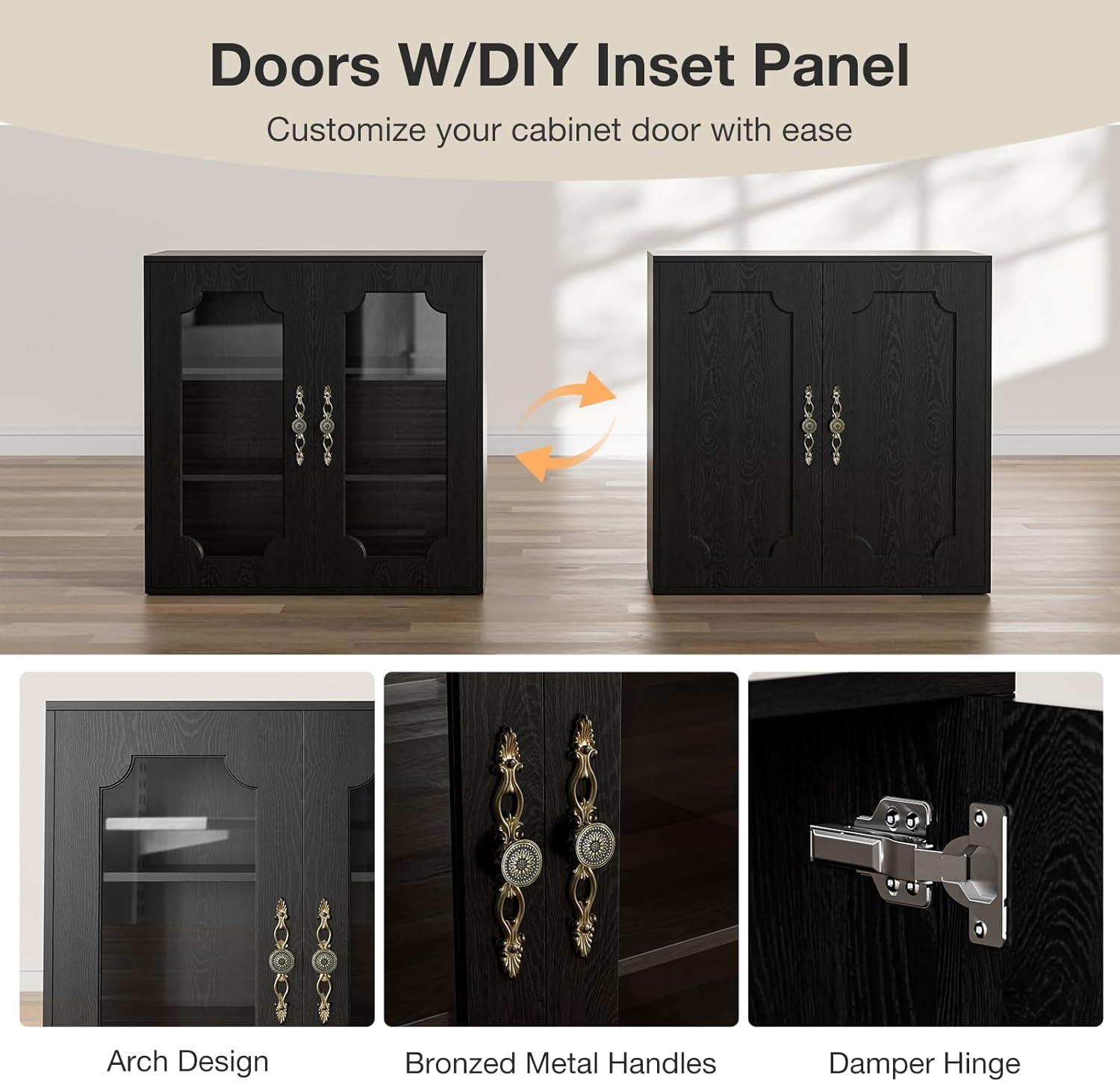 • Replaceable Door Panel:Features recessed door panel frames, equiped with 2 kinds of panels, you can diy the cabinet door with glass or wooden panels.The glass doors could display your favorite decor and convenient for using, while the wooden doors provide hidden storage for dining essentials or others.