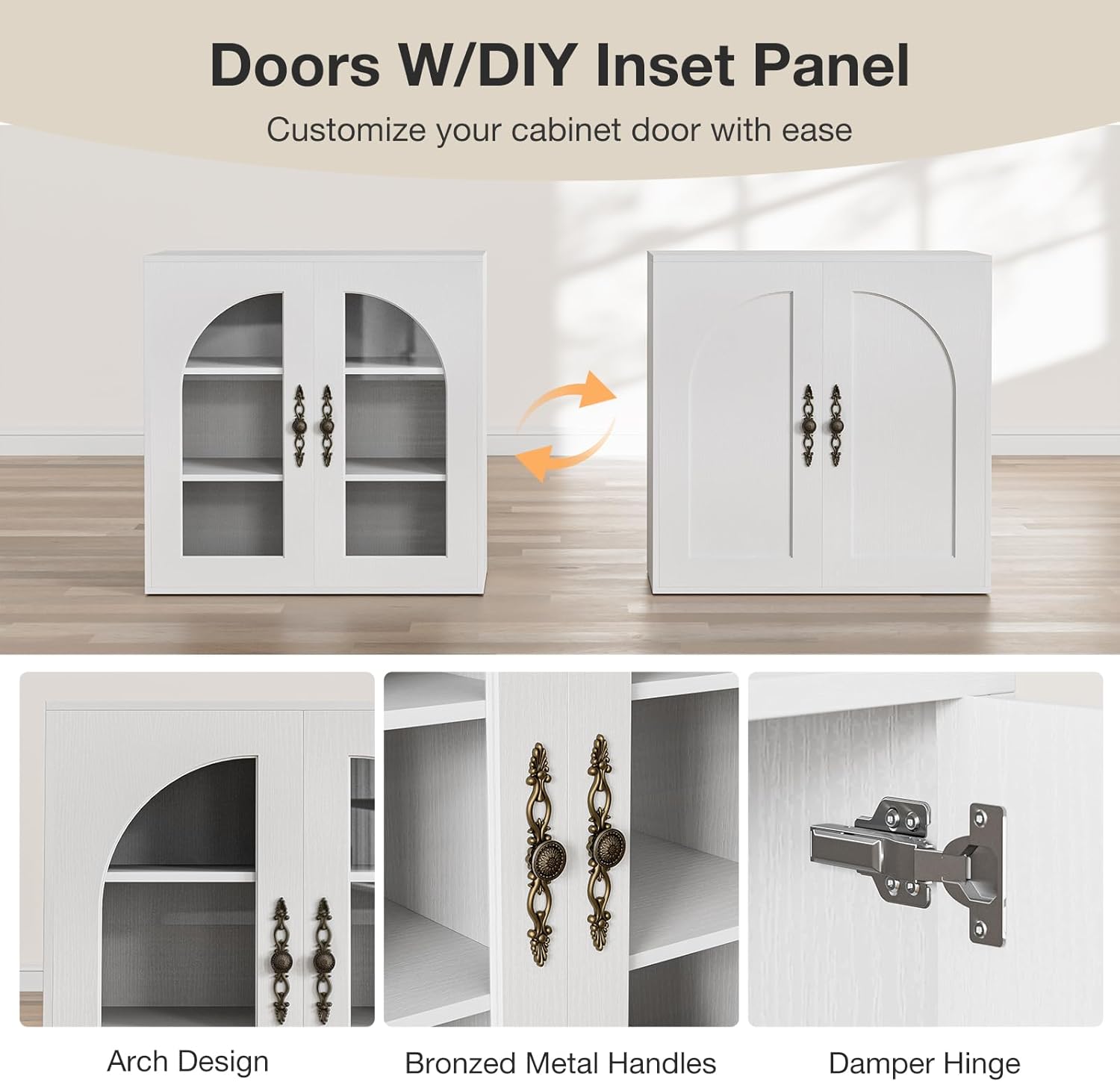 • Replaceable Door Panel:Features recessed door panel frames, equiped with 2 kinds of panels, you can diy the cabinet door with glass or wooden panels.The glass doors could display your favorite decor and convenient for using, while the wooden doors provide hidden storage for dining essentials or others.