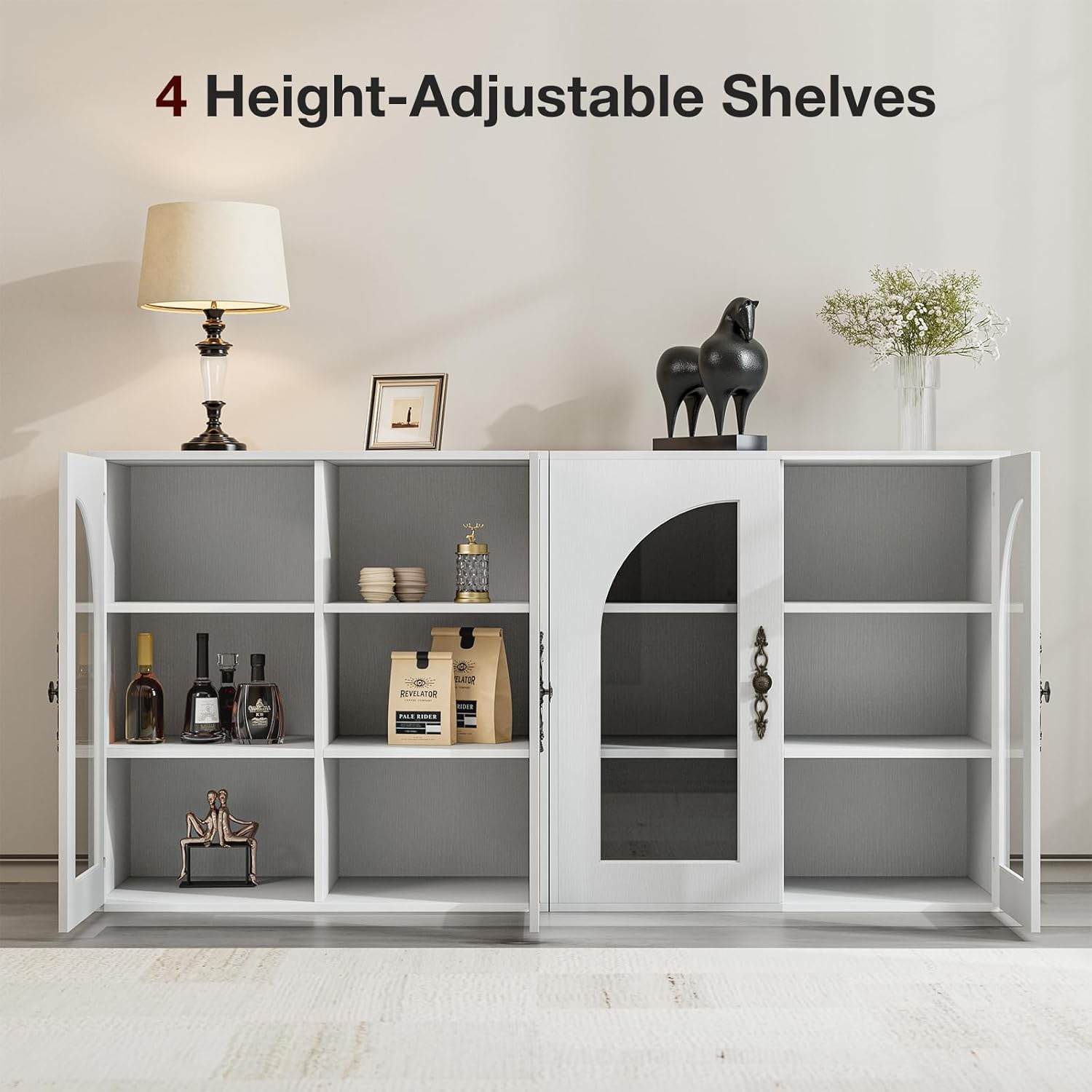 • Spacious Storage Space: Designed for modern homes, this large sideboard cabinet offers ample storage with 4 compartments, perfect for organizing kitchenware, dining essentials, or everyday items. Equipped with adjustable shelves, this buffet table allows flexible organization to fit various storage needs.